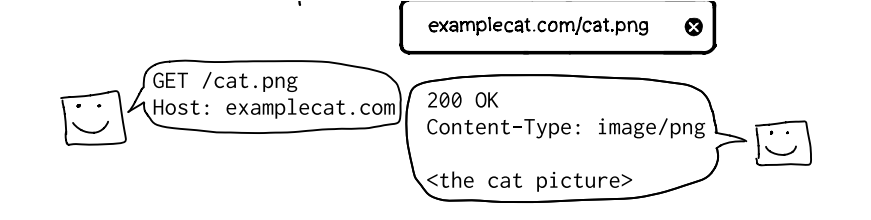 La ilustración es un esquema muy simple del intercambio HTTP para conseguir una imagen: a la izquierda un cliente (navegador) hace una petición GET /cat.png con el encabezado Host: examplecat.com, y a la derecha el servidor responde 200 OK con Content-Type: image/png y en el cuerpo va la imagen del gato. Visualmente resalta las tres piezas esenciales de la comunicación: la línea de petición (método + recurso), los encabezados que identifican el destino y al cliente, y la línea de estado más los encabezados de respuesta que describen el tipo de contenido seguido por el body binario (la imagen).