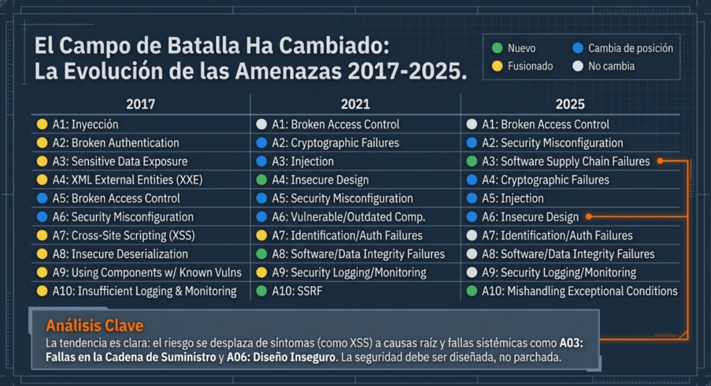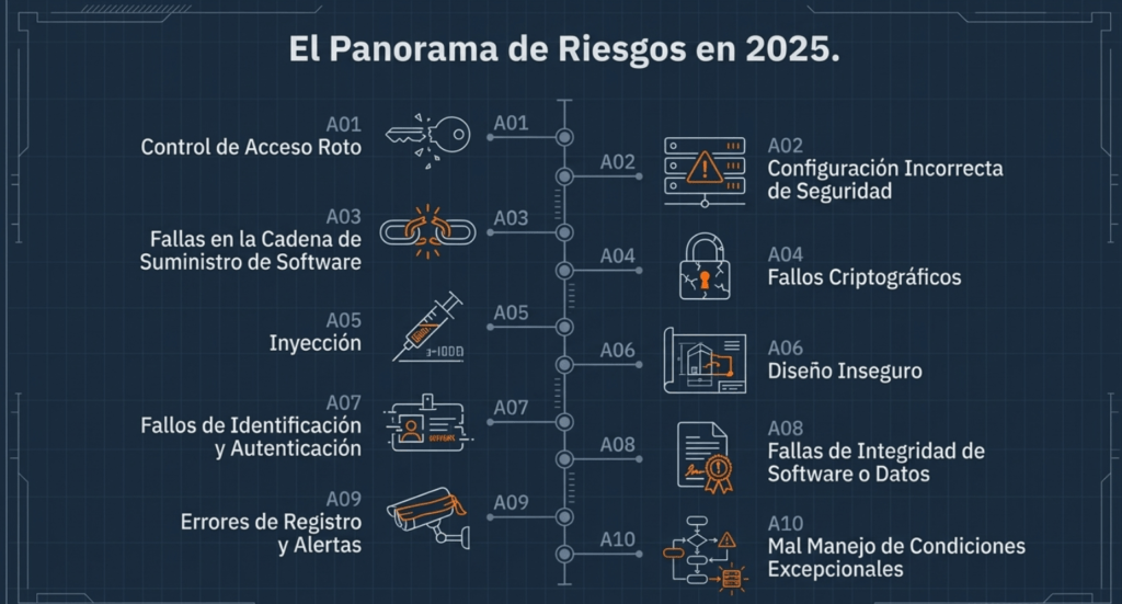La edición 2025 introduce dos categorías nuevas y consolida otras, con un enfoque más fuerte en causas raíz en lugar de síntomas. Si bien sigue siendo un Top 10, OWASP reconoce que la complejidad del software hace imposible evitar cierto grado de superposición entre categorías.