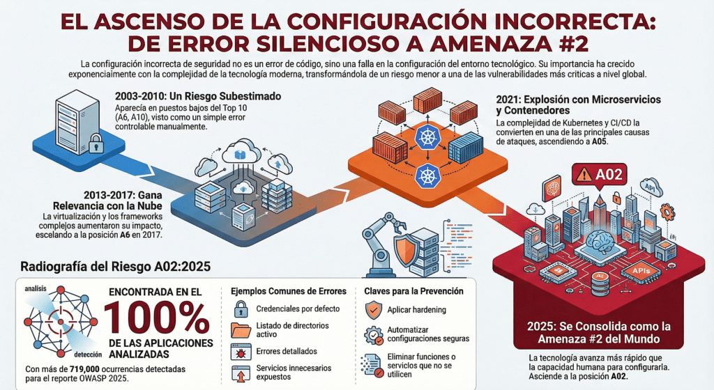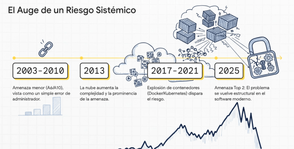 La complejidad del software moderno aumenta el número de configuraciones, y por ende, las posibilidades de error: servicios expuestos, CORS abiertos, headers faltantes, puertos no protegidos, frameworks mal configurados, etc.