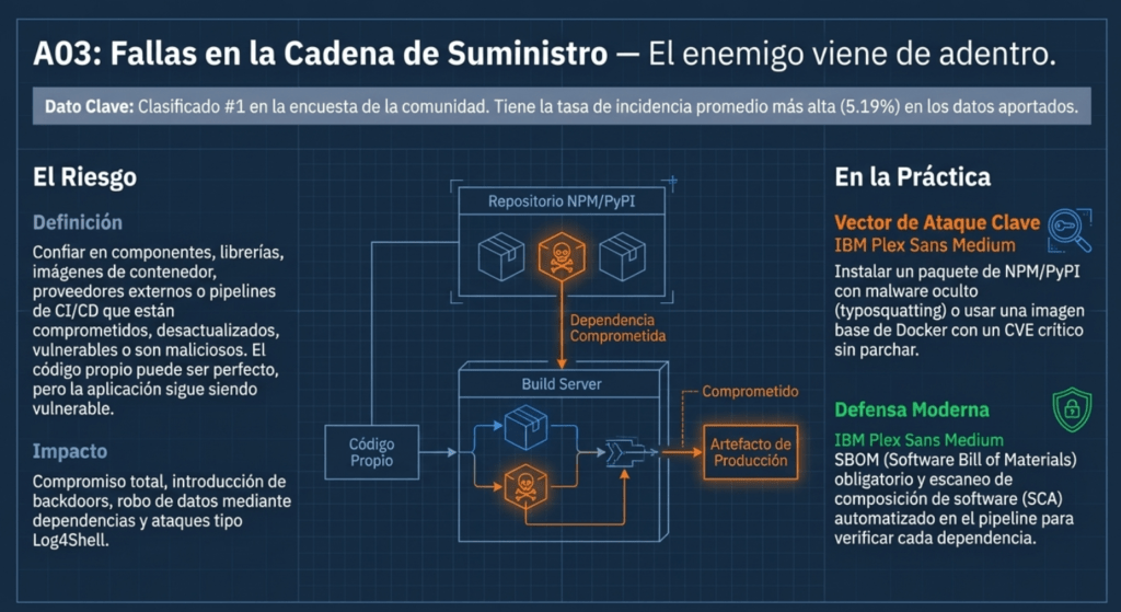 Es una de las preocupaciones más votadas por la comunidad. Representa ataques tipo SolarWinds, paquete NPM malicioso, dependencias con malware o librerías manipuladas.