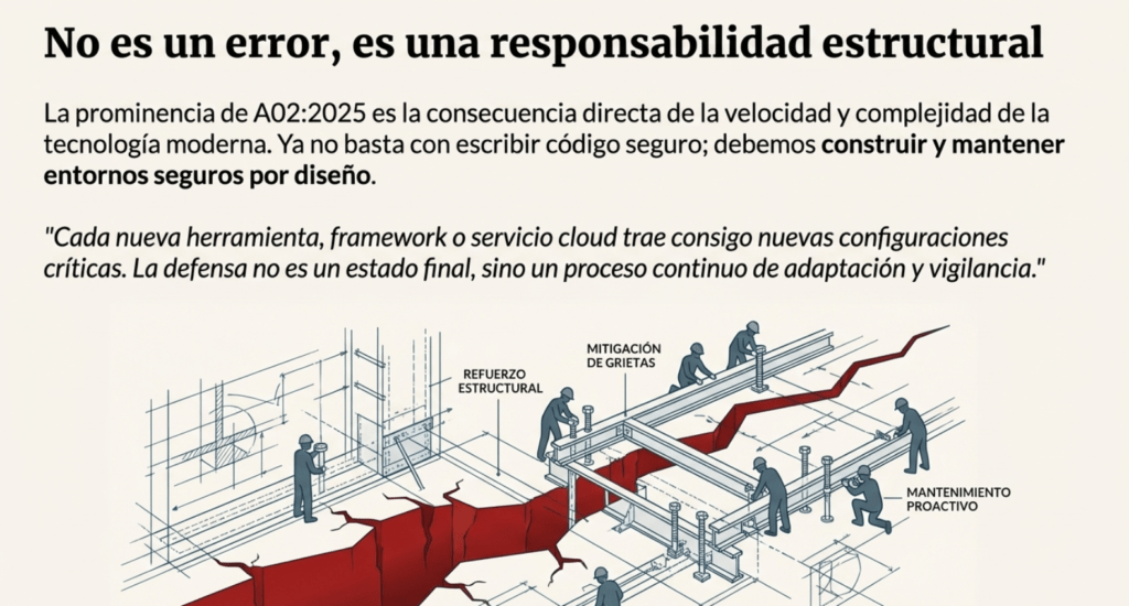 Finalmente, el ascenso de Security Misconfiguration al puesto A02:2025 debe interpretarse como una advertencia global. OWASP indica que los errores de configuración han pasado de ser fallas aisladas a convertirse en el talón de Aquiles del software moderno. Cada nueva herramienta, framework o servicio cloud trae consigo nuevas configuraciones críticas que pueden ser mal interpretadas o mal aplicadas. La industria, además, se encuentra en una carrera difícil entre automatizar configuraciones seguras y evitar que la velocidad del desarrollo genere brechas inadvertidas. El A02:2025 simboliza ese desafío: no importa cuán avanzado sea el sistema, cuánta criptografía use o cuán sólido sea su diseño, si está mal configurado, fallará.