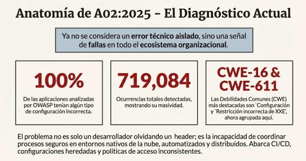 Lo más llamativo es que, en 2025, Security Misconfiguration ya no se limita a un error técnico: OWASP lo describe como una señal de fallas en todo el ecosistema organizacional. No se trata solo de un desarrollador olvidando un header de seguridad o un administrador dejando un puerto abierto; se trata de la incapacidad de las organizaciones de coordinar procesos seguros en entornos nativos cloud, automatizados y distribuidos. La categoría ahora abarca errores en la configuración de CI/CD, configuraciones heredadas, políticas de acceso inconsistentes, exposición accidental de archivos sensibles, configuraciones por defecto inseguras y falta de hardening integral. Esto confirma que la categoría no es un riesgo puntual, sino estructural, transversal a todo el ciclo de vida.