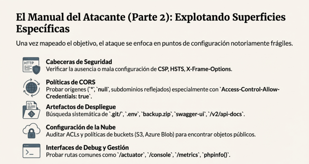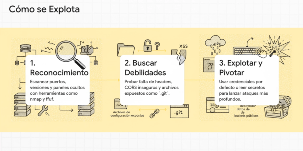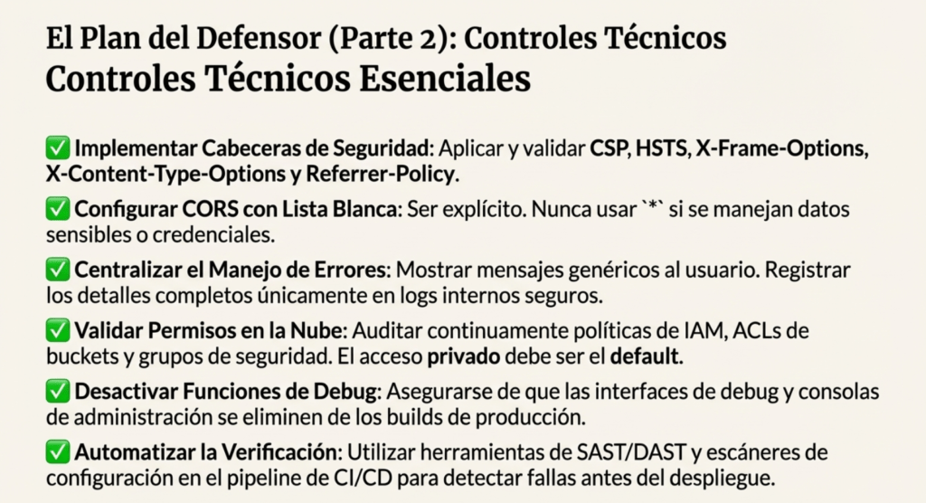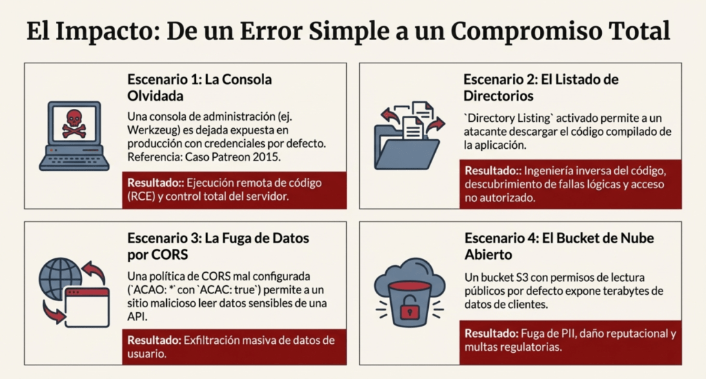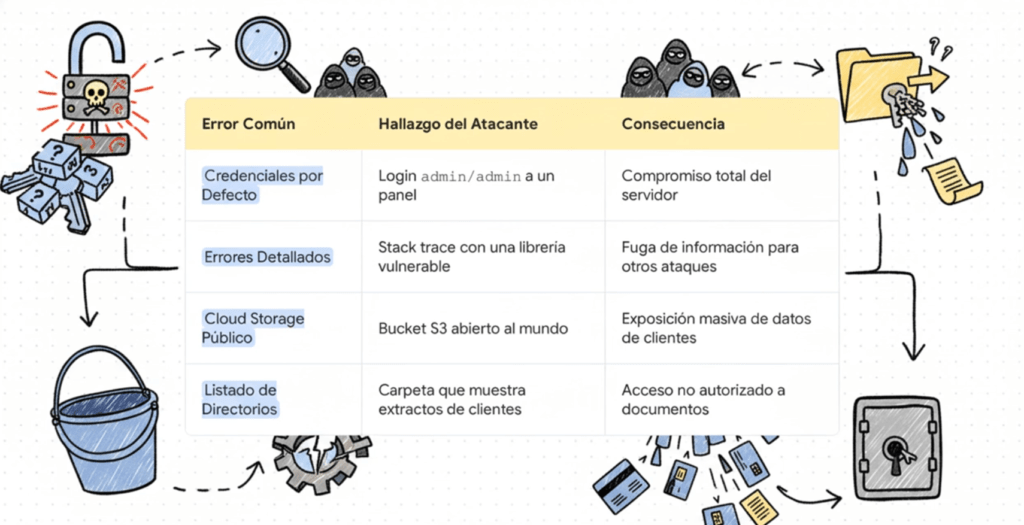 Ya entendés cómo un simple detalle —un panel de admin sin protección, un bucket público, un CORS permisivo, un listado de directorios, una cabecera mal configurada o un error verboso— puede abrirle la puerta al atacante y permitirle comprometer datos, escalar privilegios o tomar control total del sistema.