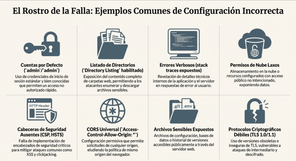 Esta vulnerabilidad no depende del código en sí, sino de cómo está configurado el entorno que lo sostiene: servidores, contenedores, cloud, frameworks, bases de datos, APIs, paneles de administración, CORS, TLS, cabeceras HTTP, debug, archivos sensibles expuestos, permisos, y muchísimo más.