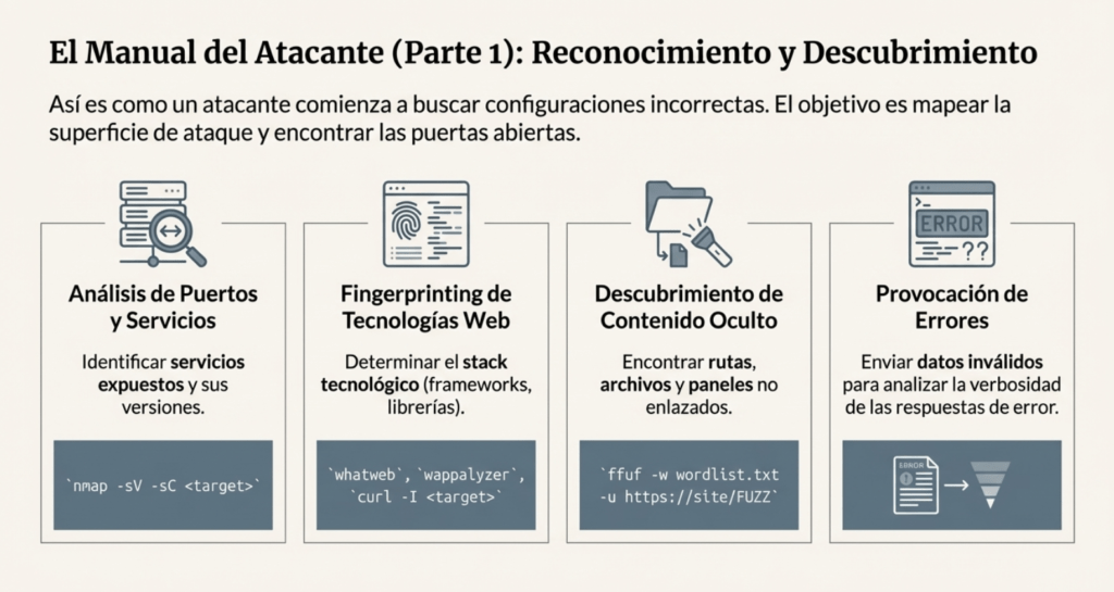 • Te va a entrenar para pensar como un hacker: buscando accesos olvidados, defaults inseguros, rutas no protegidas, paneles de debug, buckets públicos, configuraciones laxas y errores verbosos que revelan demasiado.