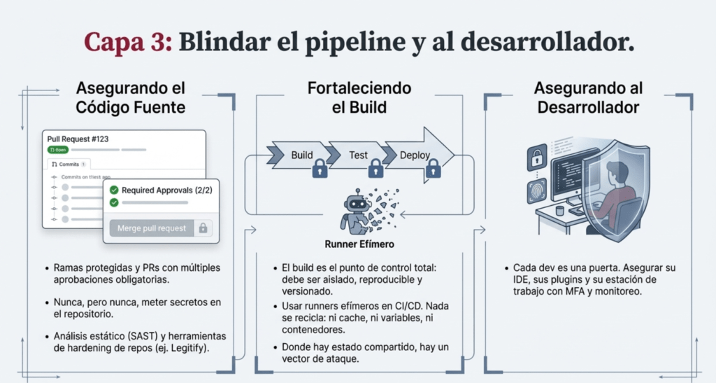 Tercero: el código fuente no se toca sin revisión. Usá ramas protegidas, pull requests con múltiples aprobaciones, análisis estático, herramientas como Legitify, y nunca, pero nunca, metas secretos al repo. Cada dev es una puerta. Su IDE, sus plugins, sus configuraciones. Asegurá esa puerta.