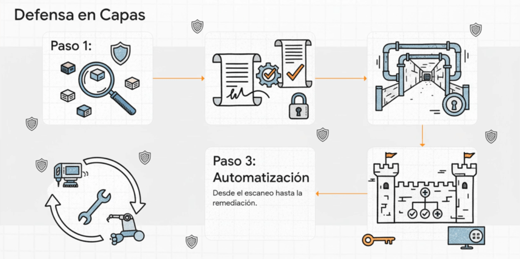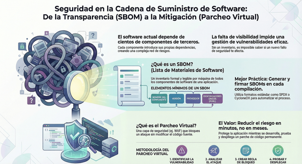 🔹 Técnicas reales como parcheo virtual, análisis de dependencias, auditoría de repositorios, verificación de imágenes y control de builds.
