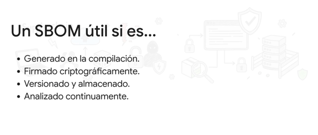 El SBOM permite saber qué está instalado, su versión, hash y procedencia.
