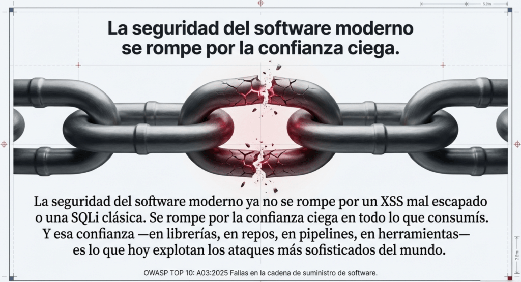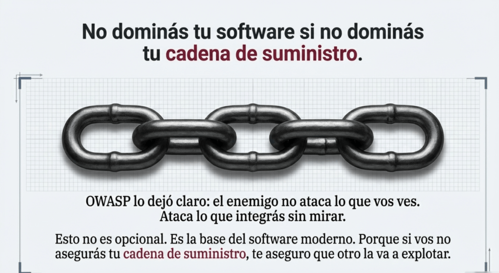 OWASP lo dejó claro en A03: el enemigo no ataca lo que vos ves. Ataca lo que integrás sin mirar. Y si no dominás tu cadena de suministro, entonces no dominás tu software. Esto no es opcional. Es la base del software moderno. Porque ya no estamos peleando contra exploits de hace 20 años. Estamos peleando contra cadenas de confianza quebradas, builds contaminados, dependencias zombis y pipelines vulnerables.