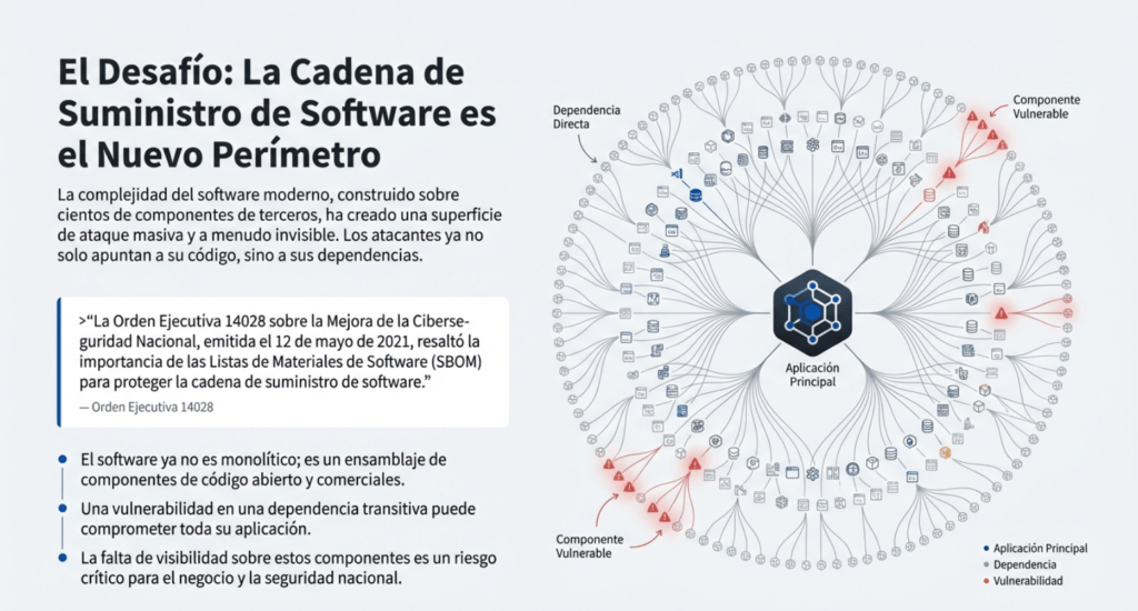 La mayoría del software moderno depende de cientos o miles de componentes que no controla. Una vulnerabilidad en una librería transitiva o un repositorio comprometido puede impactar a miles de organizaciones (casos: SolarWinds, Log4Shell, ataques en VS Code Marketplace, Bybit 2025).