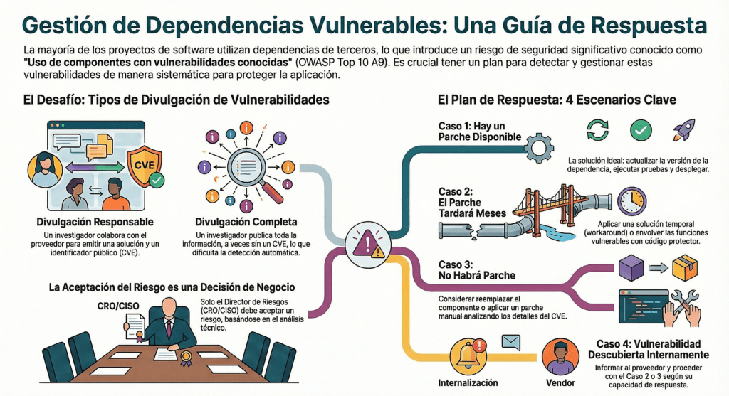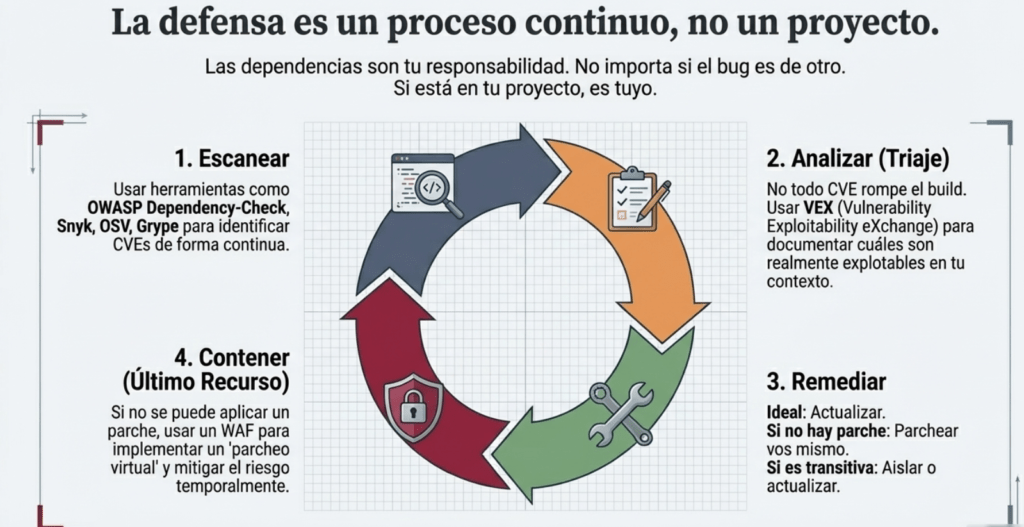 Cuarto: las dependencias son tu responsabilidad. No me importa si el bug es de otro. Si lo tenés en tu proyecto, es tuyo. Escaneá con OWASP Dependency-Check, Snyk, OSV, Grype, y después hacé triaje con VEX. No todo CVE rompe la build, pero todo CVE se analiza. Si no hay parche, parcheás vos. Si el proveedor no responde, lo forkeás. Si es transitive, lo aislás. Y si no podés, lo envolvés. Así se hace seguridad en serio.
