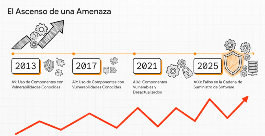 OWASP no está improvisando. Viene alertando desde 2013 con “componentes vulnerables o desactualizados” (A09). Pero recién ahora, con A03:2025, reconoce la verdadera dimensión del riesgo. Porque ya no se trata solo de versiones viejas. Se trata de ataques a repositorios públicos, typosquatting, builds contaminados, CI/CD mal configurados, herramientas dev comprometidas, firmas falsificadas, falta de SBOM, y updates automáticos que instalan malware en silencio.