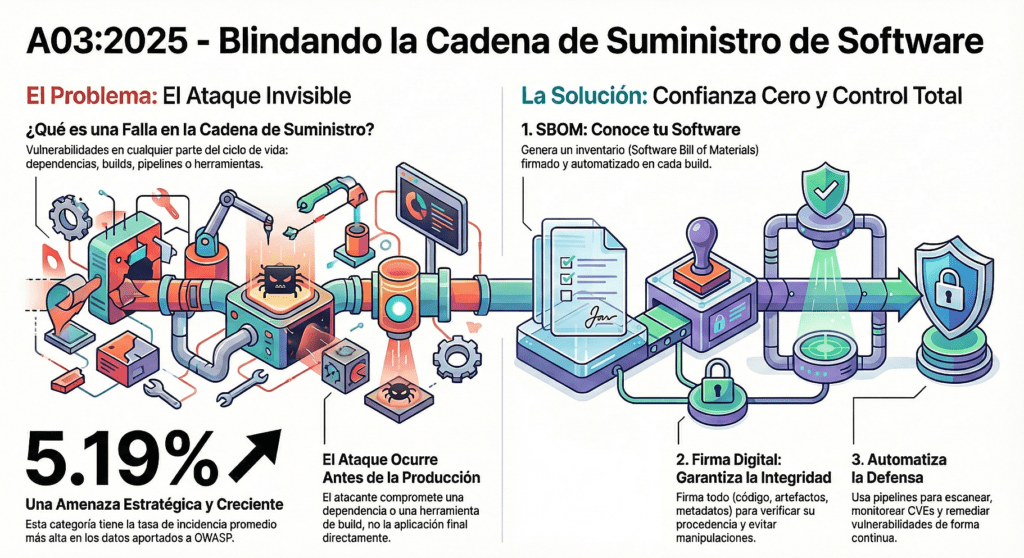 A03:2025 Fallas en la Cadena de Suministro de Software refleja un riesgo creciente: la mayoría de las aplicaciones modernas dependen de cientos de componentes externos y un solo eslabón débil puede comprometer toda la aplicación. Incluye el uso de dependencias vulnerables, paquetes maliciosos, typosquatting, imágenes de contenedores inseguras, scripts de CI/CD manipulados, SDKs inseguros y falta de verificación de firmas o integridad. La mitigación requiere SBOM, análisis de composición (SCA), verificación de firmas, hardening de pipelines, contenedores mínimos y control estricto de dependencias directas y transitivas. Es un riesgo crítico porque compromete aplicaciones aún cuando el código propio no tiene fallos.