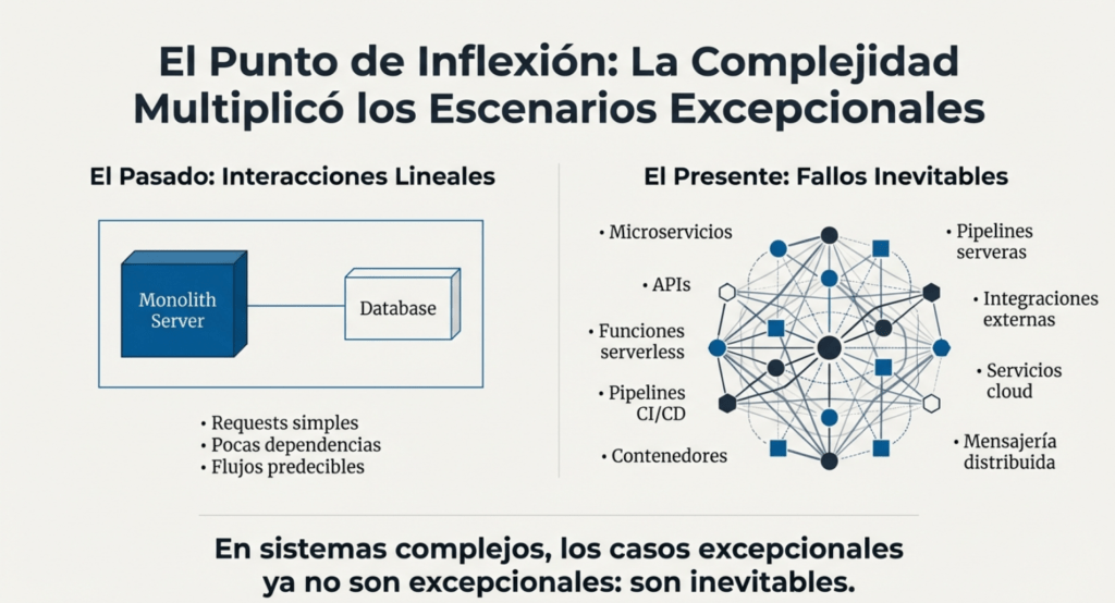 En este contexto, los casos excepcionales —timeouts, fallos en cadena, interrupciones, errores de parseo, datos incompletos, respuestas inesperadas, saturación, fallos en terceros, retrasos en red, desbordes lógicos— ya no son excepcionales: son inevitables.