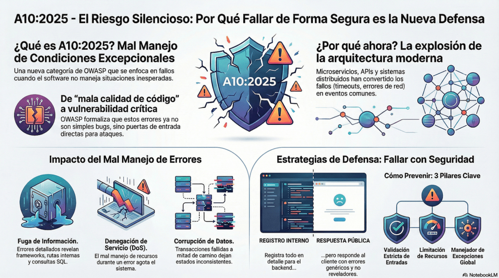 A10:2025 Manejo Inadecuado de Condiciones Excepcionales es una categoría nueva que representa todos los fallos que ocurren cuando la aplicación enfrenta errores o situaciones anómalas: fallos en parámetros, nulos, timeouts, caídas de servicios externos, errores de lógica, fallos de autorización y comportamientos “fail-open”. Cuando estos errores no se manejan correctamente, pueden provocar bypass de autenticación, exposición de información sensible, inconsistencias de datos, duplicación de transacciones y acceso indebido a recursos. La mitigación exige fail-secure, validación estricta de parámetros, manejo centralizado de errores, circuit breakers, fallback seguro y testing de caos. Si la aplicación falla abierta, falla por completo.