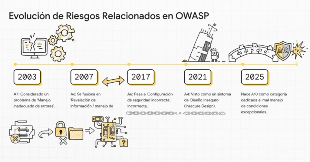 Aunque estos problemas existían desde los años 2000, no aparecieron como categoría formal porque OWASP buscaba agrupar vulnerabilidades de alto impacto y alta frecuencia. En ese entonces, la web era más simple: requests lineales, interacciones básicas, pocas dependencias internas. Los escenarios excepcionales eran escasos y, cuando ocurrían, normalmente el sistema simplemente devolvía un error genérico. Con el tiempo, la arquitectura del software cambió y los fallos que antes eran anecdóticos pasaron a convertirse en problemas sistémicos.