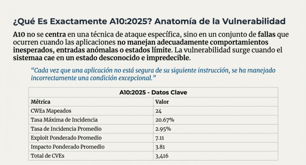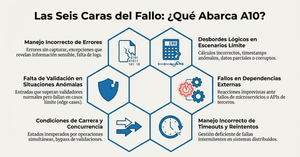 Este nuevo riesgo de OWASP 2025 surge como respuesta al manejo deficiente de errores y fallos del sistema. A diferencia de categorías anteriores demasiado genéricas, A10 se enfoca específicamente en situaciones donde una aplicación no anticipa, detecta o maneja correctamente condiciones excepcionales —es decir, situaciones inusuales, impredecibles o que alteran el flujo esperado.