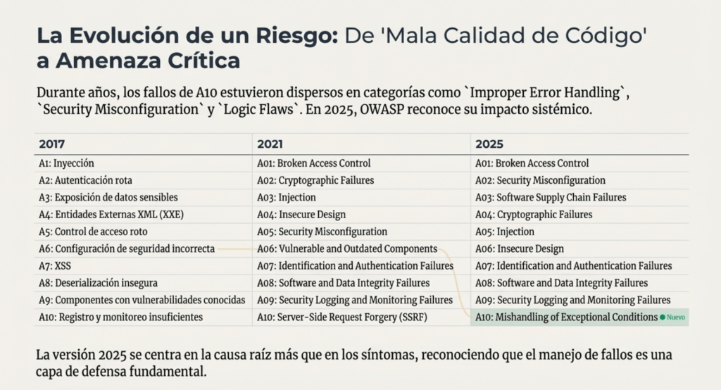 • Por qué OWASP incorporó A10 como categoría específica en 2025, separándola finalmente de la genérica “mala calidad de código”.