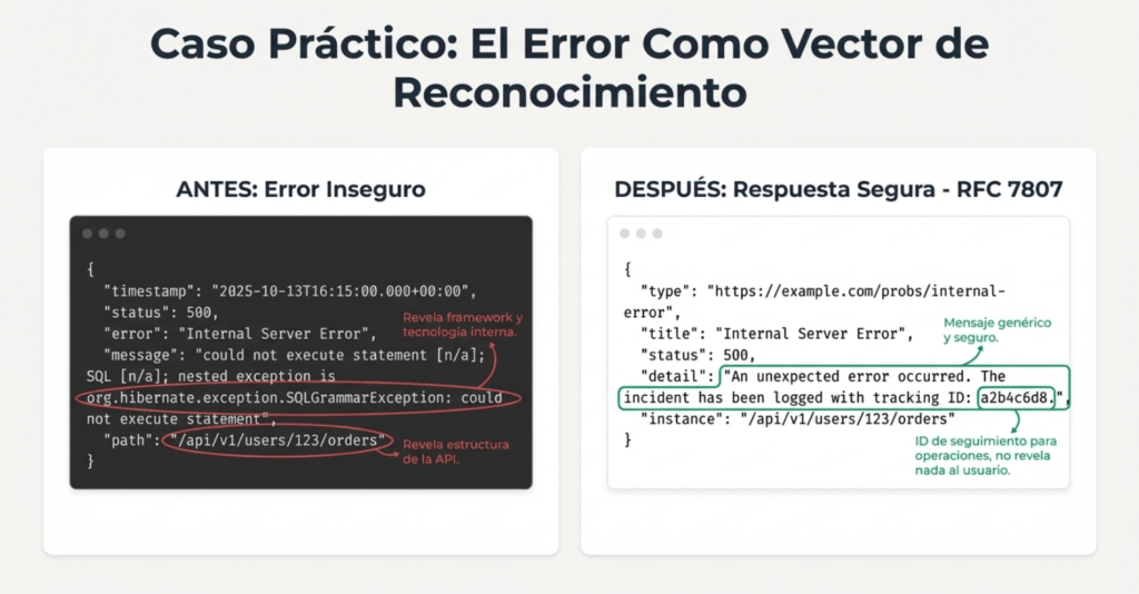 • Que un error expuesto al cliente es un vector de reconocimiento ofensivo que revela internals de la aplicación.