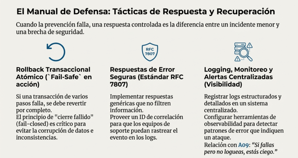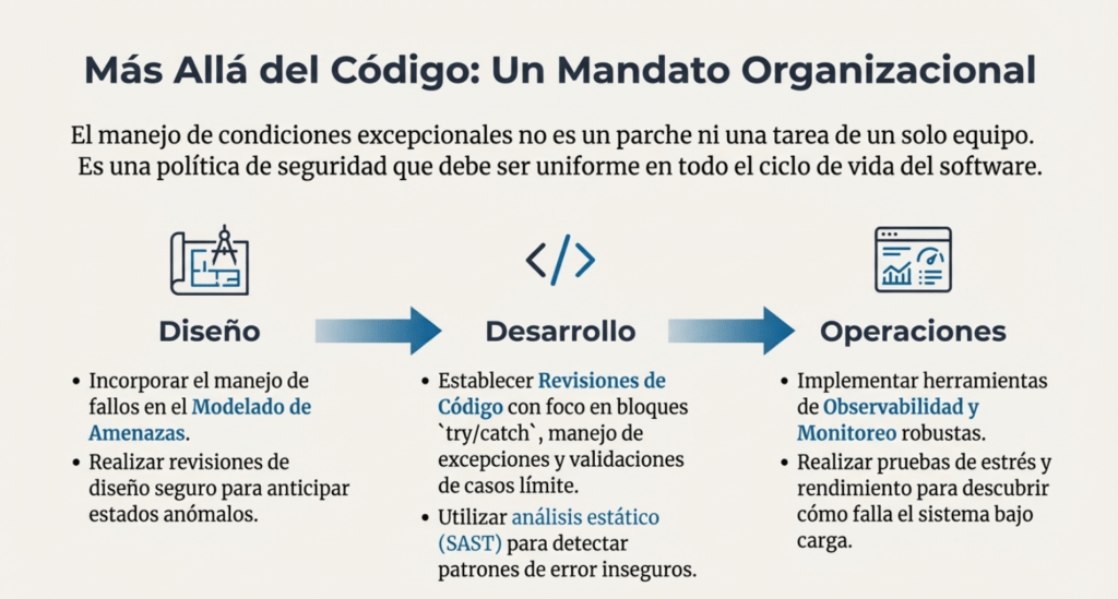Además, se resalta la importancia de que toda la organización maneje los errores de forma uniforme. Desde el diseño hasta la producción, el manejo de condiciones excepcionales debe formar parte de la arquitectura de seguridad: modelado de amenazas, validación de entradas, rollback de transacciones, protección de logs y uso de herramientas de observabilidad.