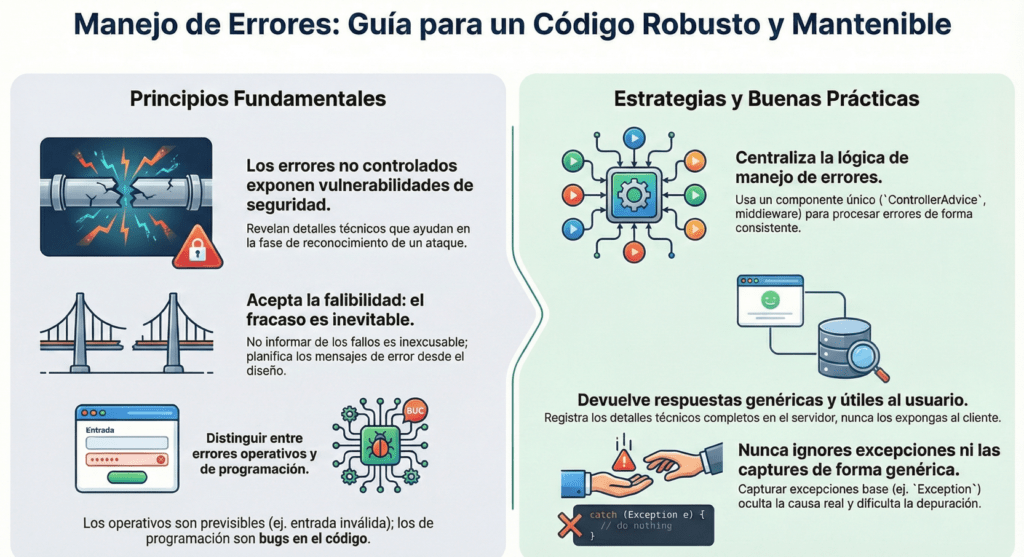 • Cómo los ataques DoS, las condiciones de carrera y los errores lógicos aparecen cuando el manejo de errores es deficiente.