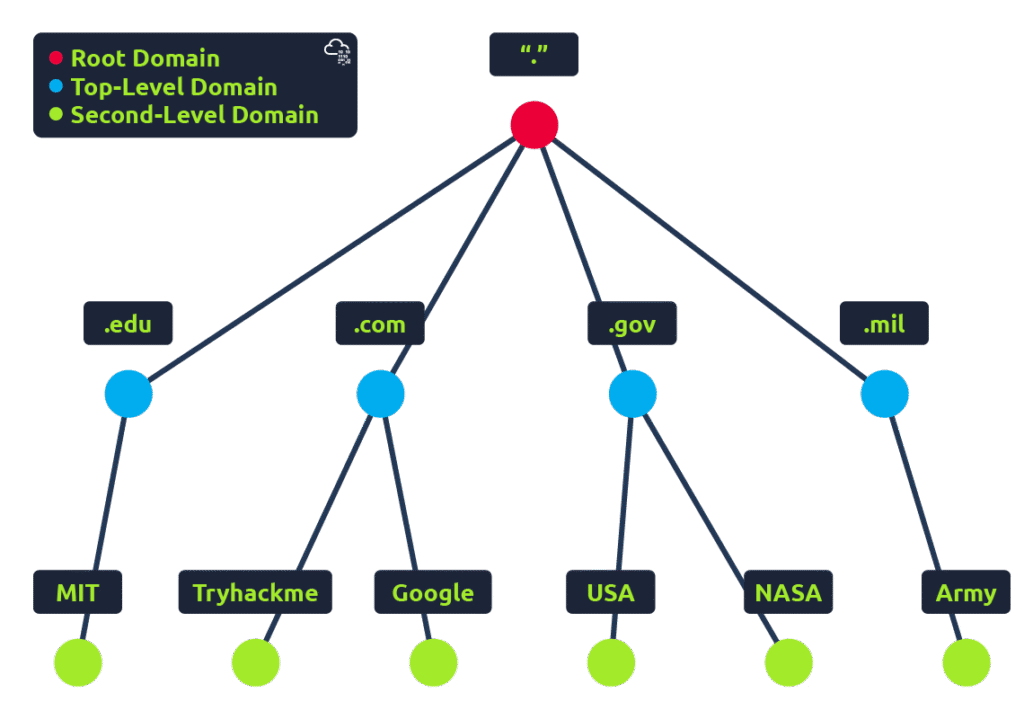Un TLD es la parte más a la derecha de un nombre de dominio. Por ejemplo, el TLD tryhackme.com es .com . Existen dos tipos de TLD: gTLD (nivel superior genérico) y ccTLD (dominio de nivel superior de código de país). Históricamente, un gTLD se utilizaba para indicar al usuario el propósito del nombre de dominio; por ejemplo, un .com se utilizaba para fines comerciales, .org para una organización, .edu para educación y .gov para el gobierno. Un ccTLD también se utilizaba para fines geográficos; por ejemplo, .ca para sitios ubicados en Canadá, .co.uk para sitios ubicados en el Reino Unido, etc. Debido a esta demanda, existe una afluencia de nuevos gTLD, como .online, .club, .website, .biz y muchos más. Para obtener una lista completa de más de 2000 TLD, haga clic aquí .