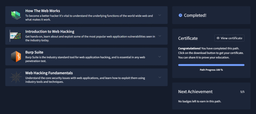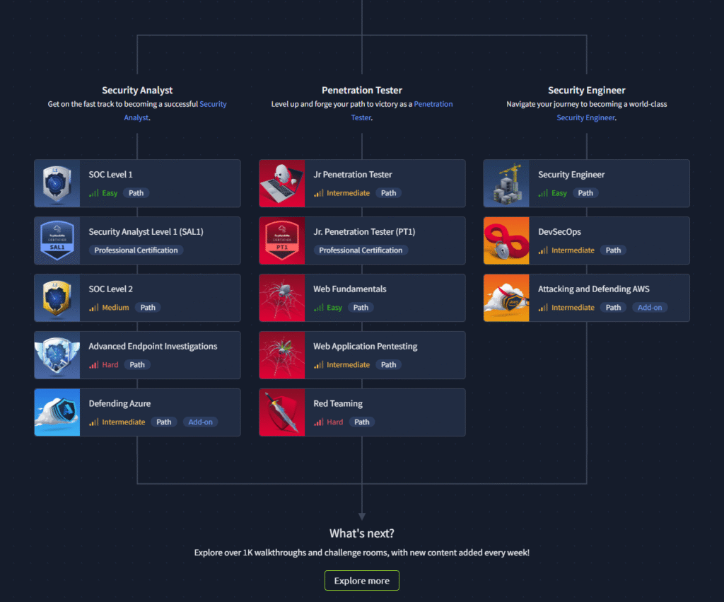 Ir resolviendo las diferentes Rooms nos otorgará puntos e insignias conforme lo hayamos logrado, estos puntos nos servirán para mejorar nuestra clasificación en el ranking e ir elaborando un perfil que poco a poco indica que somos hackers más experimentados. También existen los Paths, que básicamente son un conjunto de Rooms agrupadas en base a adquirir conocimientos para un objetivo. (Por ejemplo, las certificaciones Comptia Pentest+ o el OSCP).