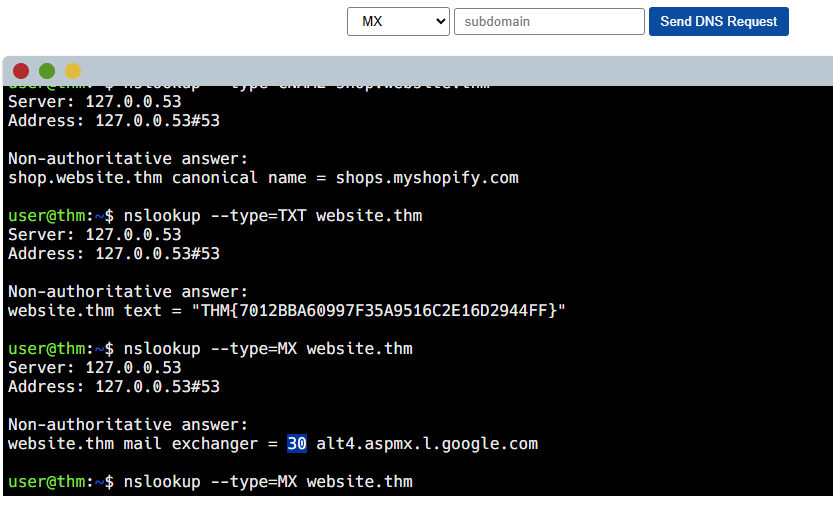 Nota: en el laboratorio de THM los nombres website.thm y shop.website.thm son ejemplos/objetivos de la sala — ejecuta las consultas desde tu máquina o desde el navegador/ejecutor DNS que ofrece la sala si tu entorno no resuelve .thm localmente.
