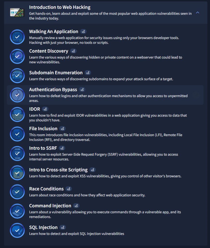 Esta sección se enfoca en presentar la plataforma TryHackMe y la industria de la ciberseguridad y viene a reemplazar a la vieja ruta «Complete Beginner» . Una vez que comprendas el concepto de sala virtual en TryHackMe, comenzarás a explorar las diferentes carreras en ciberseguridad para tener una mejor idea de lo que te gustaría hacer. Después de lo cual, aprenderá cómo investigar de manera efectiva para obtener respuestas complejas: la ciberseguridad es un campo muy amplio y comprender cómo encontrar información relevante será extremadamente útil.