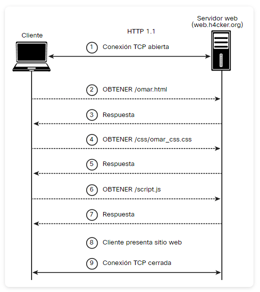 En el primer paso, el cliente abre una conexión TCP con el servidor, lo que establece el canal de comunicación necesario para intercambiar datos. Luego, en el paso 2, el navegador realiza una petición HTTP GET para obtener el archivo principal del sitio, en este caso /omar.html. El servidor responde con el contenido solicitado (paso 3), que contiene el código HTML de la página.