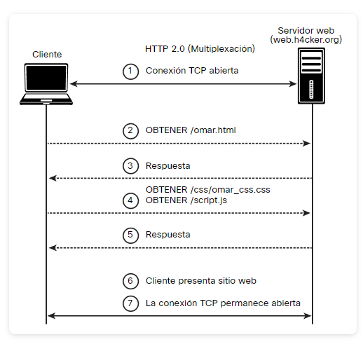 El cliente inicia el proceso enviando una petición GET /omar.html (paso 2), a la que el servidor responde con el contenido HTML solicitado (paso 3). Luego, el navegador detecta que necesita otros recursos, como hojas de estilo y scripts, pero ahora puede enviar múltiples peticiones en paralelo dentro de la misma conexión: en el paso 4, se solicitan /css/omar_css.css y /script.js al mismo tiempo.