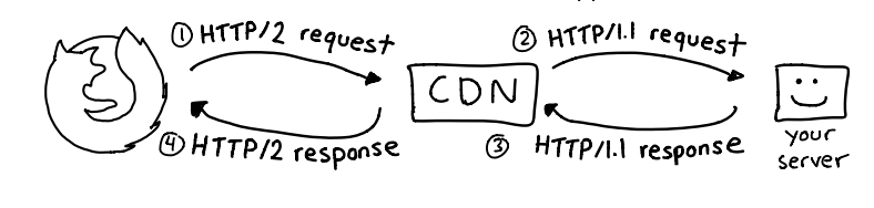 Se muestra el flujo de comunicación: el navegador envía una petición HTTP/2 a la CDN (1), la CDN traduce esa solicitud a HTTP/1.1 para contactar con el servidor de origen (2), recibe la respuesta del servidor (3) y finalmente devuelve la respuesta HTTP/2 al cliente (4). Esto ilustra cómo las CDNs actúan como intermediarias, permitiendo a los clientes usar HTTP/2 incluso cuando los servidores aún trabajan con HTTP/1.1.