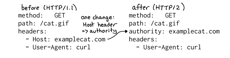 Se comparan las peticiones antes y después de HTTP/2. En HTTP/1.1, la cabecera principal es Host: examplecat.com, mientras que en HTTP/2 se reemplaza por :authority examplecat.com. El resto de los encabezados, como User-Agent, permanecen iguales. Este cambio forma parte de la normalización de campos en el nuevo estándar, que mejora la eficiencia del intercambio de datos.