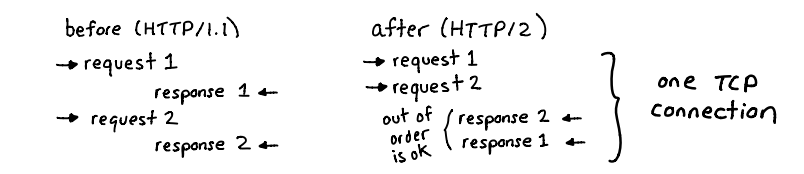 Este diagrama ilustra claramente la ventaja principal de HTTP/2.0: la multiplexación de peticiones y respuestas sobre una única conexión TCP, lo que hace que la carga de las páginas sea mucho más rápida y eficiente en comparación con HTTP/1.1.
