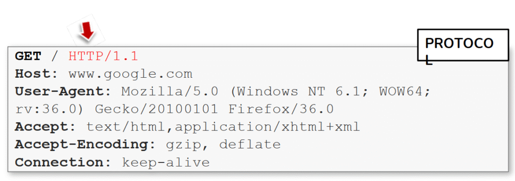La imagen muestra una petición HTTP destacando específicamente la parte del protocolo, señalada en rojo: HTTP/1.1. Esta sección aparece al final de la primera línea de la solicitud, conocida como request line, que está compuesta por tres elementos: el método (GET), el recurso solicitado (/) y la versión del protocolo (HTTP/1.1).