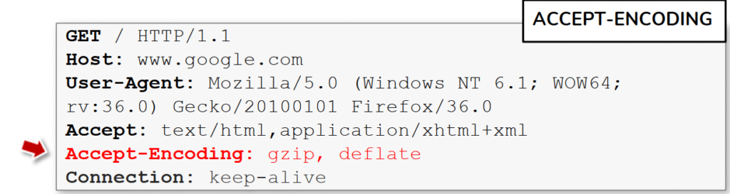La imagen resalta el encabezado Accept-Encoding dentro de una petición HTTP (Accept-Encoding: gzip, deflate) y muestra su papel: el cliente le indica al servidor qué algoritmos de compresión puede entender. Esa información permite al servidor devolver el contenido comprimido (por ejemplo gzip) para ahorrar ancho de banda y acelerar la transferencia, y por consiguiente el Content-Encoding de la respuesta deberá reflejar la selección usada.{