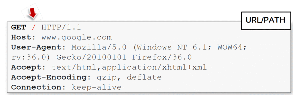 El punto clave que resalta la imagen es el path (/), que junto con el dominio forma la URL completa que el cliente solicita al servidor. Cambiar este valor modifica directamente el recurso al que se accede: por ejemplo, /login, /admin o /images/logo.png apuntarían a diferentes rutas dentro del mismo servidor.