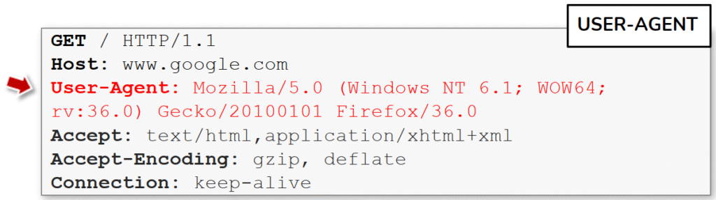 En el ejemplo, el valor indica que el cliente es el navegador Firefox 36 ejecutándose en Windows 7 (WOW64). Esta cadena sigue un formato tradicional en el que se mezclan identificadores históricos (como “Mozilla”) y detalles técnicos del entorno del cliente.