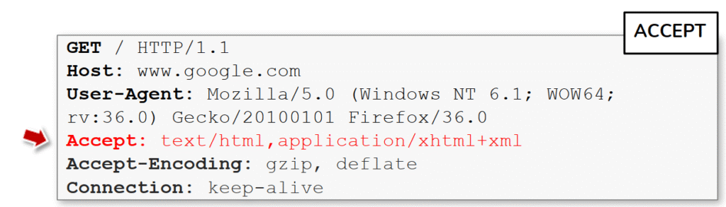 La imagen destaca el encabezado Accept dentro de una petición HTTP, mostrándolo en rojo para subrayar su función: comunicar al servidor qué tipos de contenido (MIME types) acepta el cliente. En el ejemplo aparece Accept: text/html,application/xhtml+xml, es decir, el cliente está indicando preferencia por HTML o XHTML; el servidor usará esa información para decidir si devuelve una página HTML, JSON, un archivo de imagen u otro tipo de respuesta, o incluso para seleccionar una plantilla distinta según el cliente. Técnicamente Accept puede llevar varios tipos separados por comas y parámetros q= para definir prioridades, y junto con cabeceras como Accept-Language forma parte de la negociación de contenido (content negotiation).