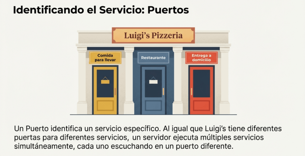 Ahora imagine que Luigi’s ofrece múltiples servicios, como comida para llevar, servicio a domicilio y entrega a domicilio. Cada servicio utiliza una puerta diferente: la puerta A para comida para llevar, la puerta B para el restaurante y la puerta C para entrega a domicilio. De igual forma, un mismo servidor puede ejecutar varios servicios simultáneamente, cada uno identificado por un puerto diferente.