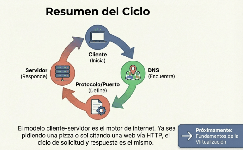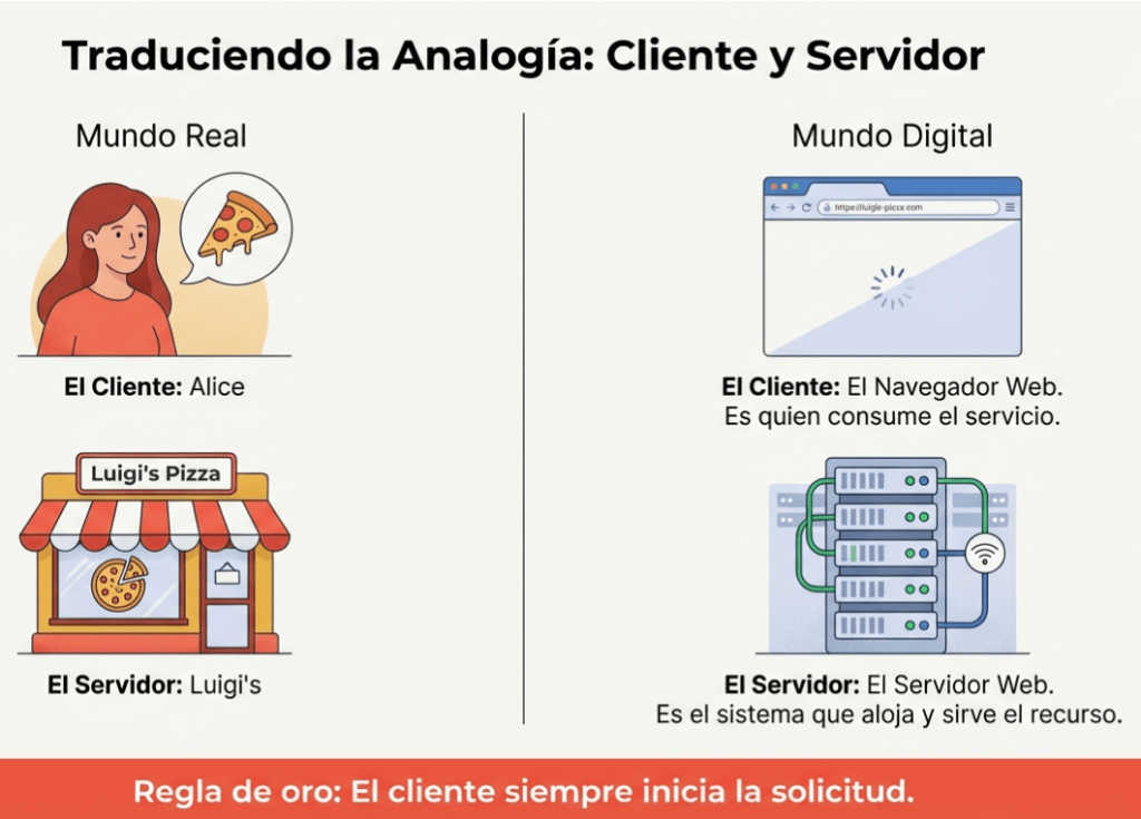 | Cliente | Sistema o navegador que inicia la solicitud de un servicio o recurso a otro sistema. | Alice (quien decide el pedido) o el navegador que solicita la página. | Es el nodo que siempre inicia la comunicación enviando una solicitud formateada. | Navegador web (Firefox, Chrome) accediendo a un sitio. |