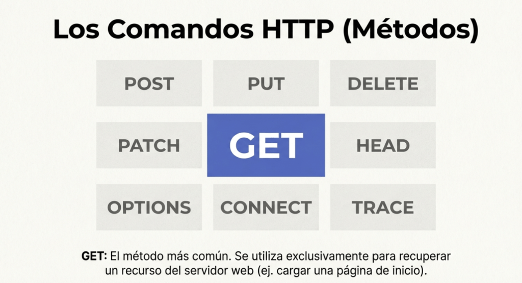 En las especificaciones principales que definen HTTP (también llamadas Solicitudes de Comentarios o documentos RFC ), hay nueve comandos principales. En la jerga HTTP , se utiliza el término «método» en lugar de «comando». A continuación, se presenta un resumen de estos métodos: