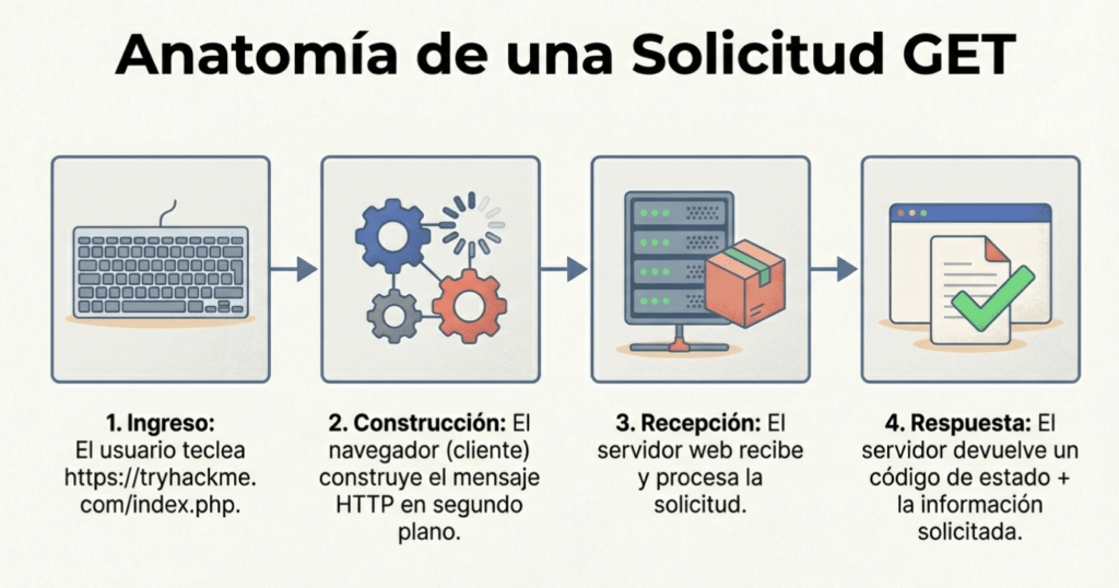 El método GET es bastante sencillo. Podemos usarlo para recuperar un recurso del servidor web. Por ejemplo, GET https://tryhackme.com/index.php. Esta solicitud recupera la página de inicio del sitio web TryHackMe. No es necesario que escribas la solicitud. Al abrir un navegador (el cliente) y escribir «https://tryhackme.com«, el navegador construye el mensaje en segundo plano utilizando la información que proporcionas y otros campos definidos en las especificaciones HTTP. Cuando el servidor web recibe la solicitud, envía una respuesta que incluye un código de estado (que indica el tipo de respuesta) y la información solicitada. La imagen a continuación muestra el flujo de esta solicitud.