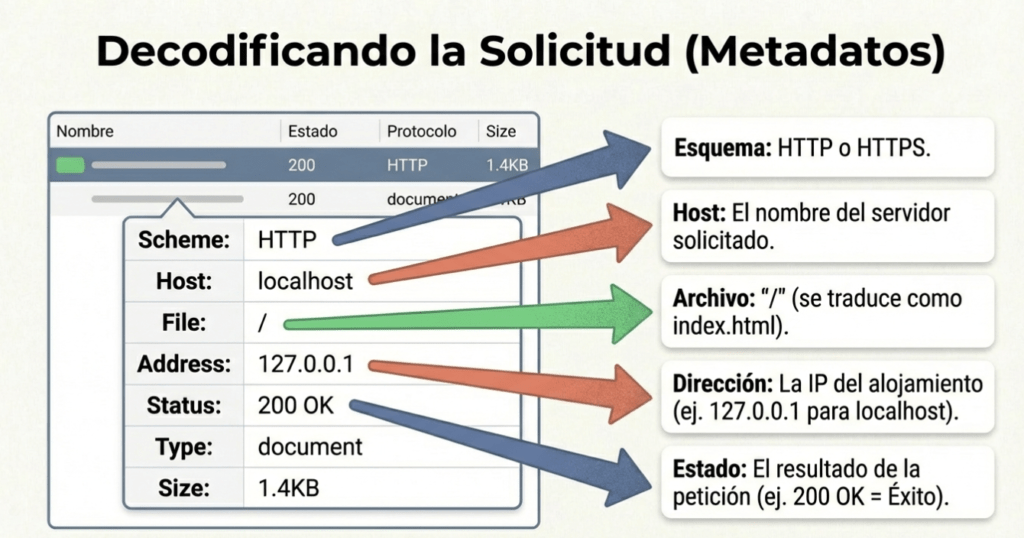 - Nombre de archivo : Indica el archivo que solicitamos al host. En nuestra solicitud, es «/», que en realidad se traduce como «index.html».