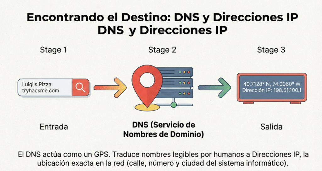 | DNS | Servicio que traduce nombres de dominio legibles por humanos en direcciones IP. | El dispositivo GPS que traduce el nombre «Luigi’s Pizza» en coordenadas exactas. | Resuelve la ubicación del servidor para que el cliente pueda establecer la conexión. | Resolución de tryhackme.com a la IP 127.0.0.1. |