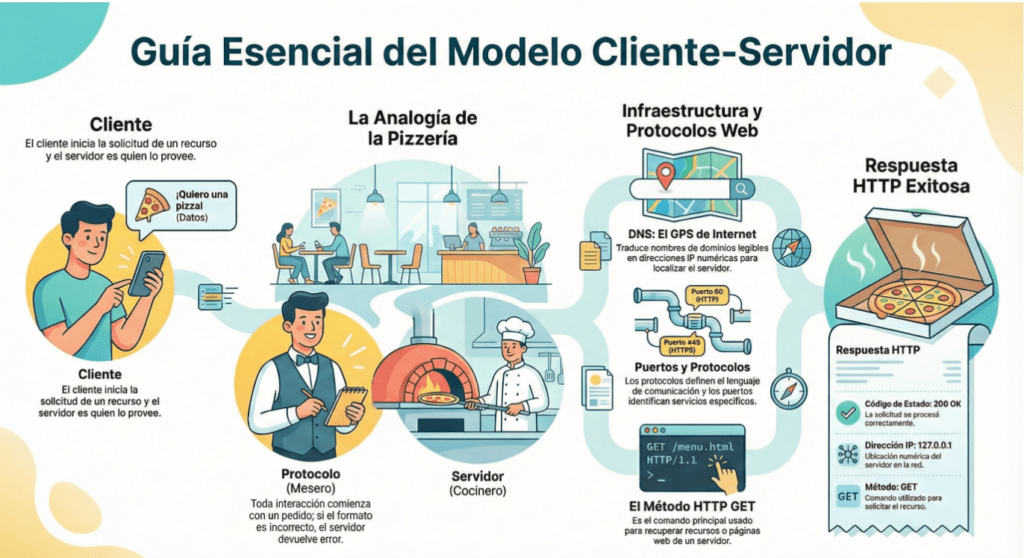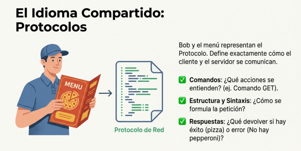 | Protocolo | Conjunto de reglas y estándares que definen cómo se comunican el cliente y el servidor. | Bob (el mensajero), el idioma inglés utilizado y el menú de la pizzería. | Define comandos, estructura de solicitudes, sintaxis y respuestas de error. | HTTP (Hypertext Transfer Protocol) o HTTPS. |