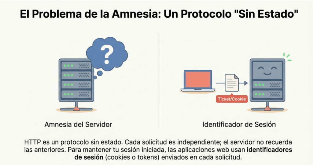 Aunque el protocolo en sí no tiene estado, los sitios web y las aplicaciones web modernos implementan mecanismos para introducir estado a nivel de aplicación. Por ejemplo, al iniciar sesión en un sitio web con sus credenciales, el servidor crea un identificador de sesión (que suele almacenarse en una cookie o token) que se envía con cada solicitud posterior. Sin estos mecanismos, tendría que autenticarse de nuevo con cada nueva solicitud, ya que el servidor no recordaría su inicio de sesión anterior.
