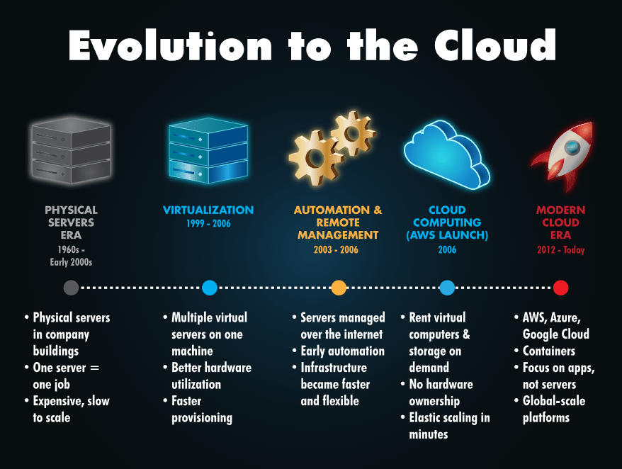 Antes de profundizar en los detalles de la nube, conviene comprender que la computación en la nube no surgió de repente. Es el resultado de muchos años de cambios en el uso y la gestión de los servidores. En cada etapa, las empresas buscaron maneras de reducir costes, utilizar los recursos de forma más eficiente y facilitar la ejecución y el escalado de sus aplicaciones. La siguiente cronología muestra esta evolución, desde los servidores físicos hasta la nube que utilizamos hoy:
