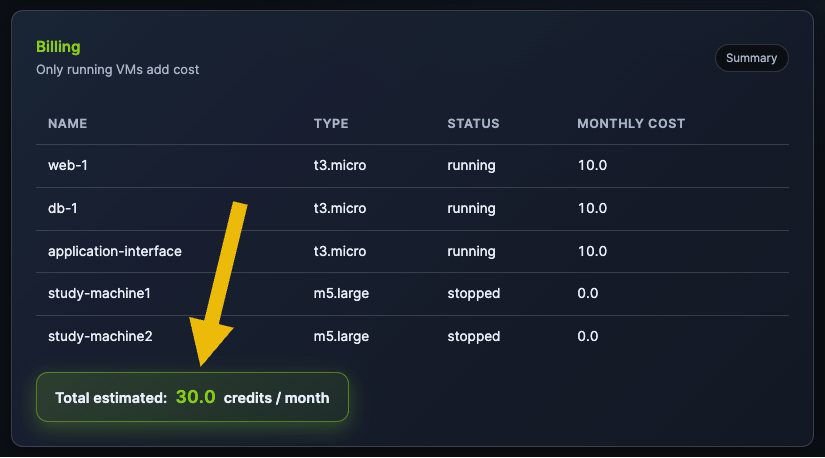 Analicemos cuánto le cuesta el crédito a nuestro entorno navegando a la Billingsección en la parte inferior de la página. Allí, puede consultar cuánto le cuesta cada tipo de instancia, así como el total