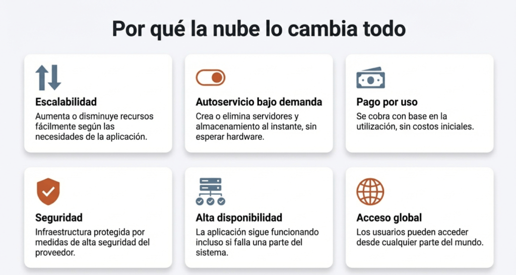 Tras observar cómo las aplicaciones evolucionaron de servidores físicos a la nube, queda claro por qué la computación en la nube se usa tan ampliamente hoy en día. La nube se diseñó para abordar problemas comunes, como la capacidad limitada, los altos costos y el crecimiento lento. Los siguientes beneficios y características explican cómo la computación en la nube facilita la ejecución, el escalado y la gestión de aplicaciones: